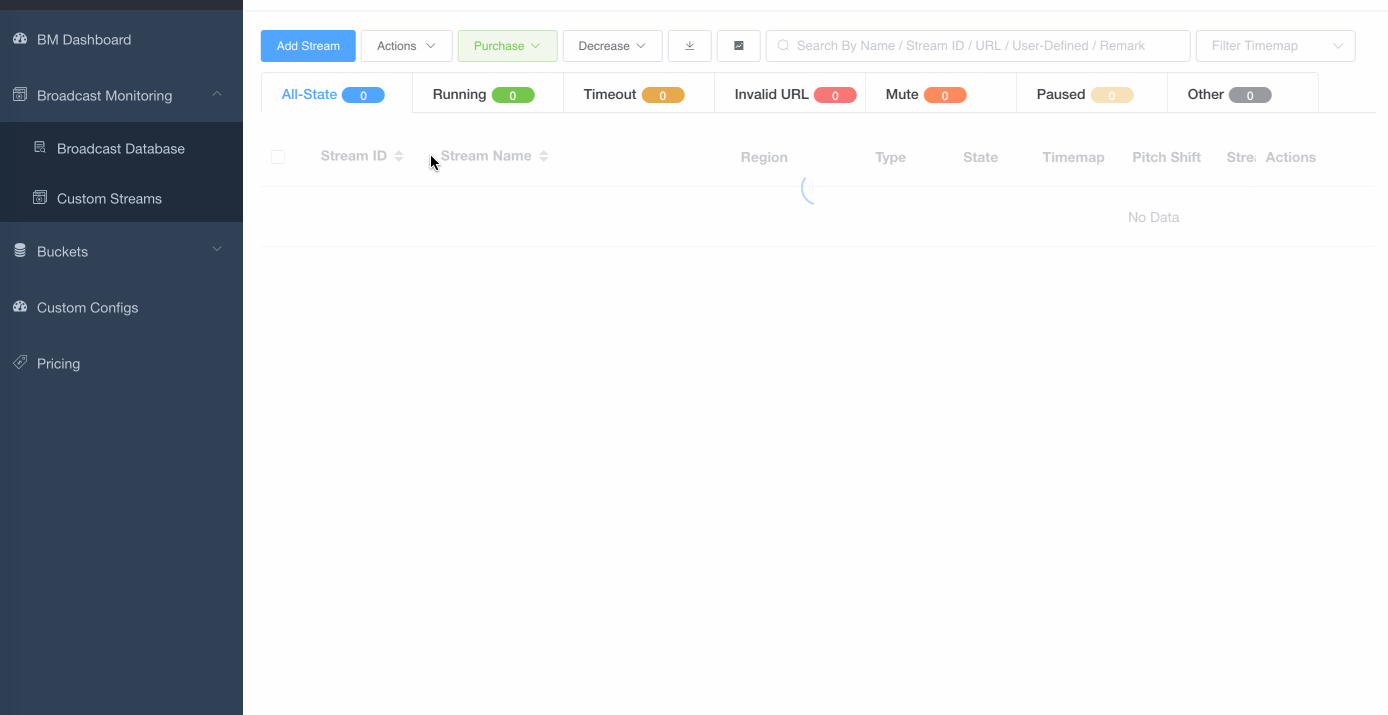 Create a “Custom Streams” project under “Broadcast Monitoring” and select “Monitor streams on ACRCloud” under “Broadcast Monitoring Type”, attach the bucket named “ACRCloud Music” and select the DSPs or codes if you want to have those DSPs’ IDs, ISRC and UPC in the monitoring results and click “Confirm” as the following image shows.