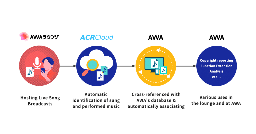 The technology used for automatic music identification is provided by ACRCloud, known as Cover Song Identification. This solution analyzes archived audio data from AWA Lounge audio live streams to identify the music used.